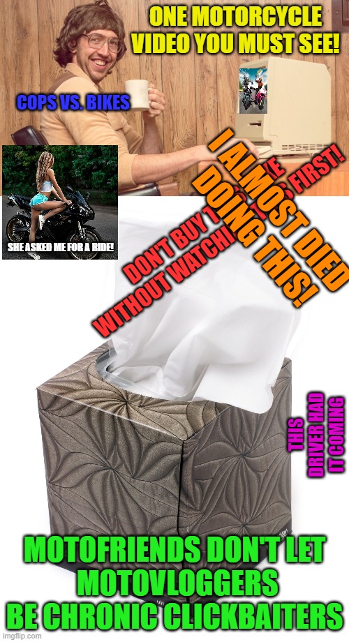 Yep, I see it all the time too, and I generally do not click on them. Nope, no thanks. Stuff like, "I got a new bike!" or "Riding to the grocery store on my Goldwing" - that's the stuff I'll click on.It is so true though, I see most of the "large" motovloggers using vague clickbait titles every week.