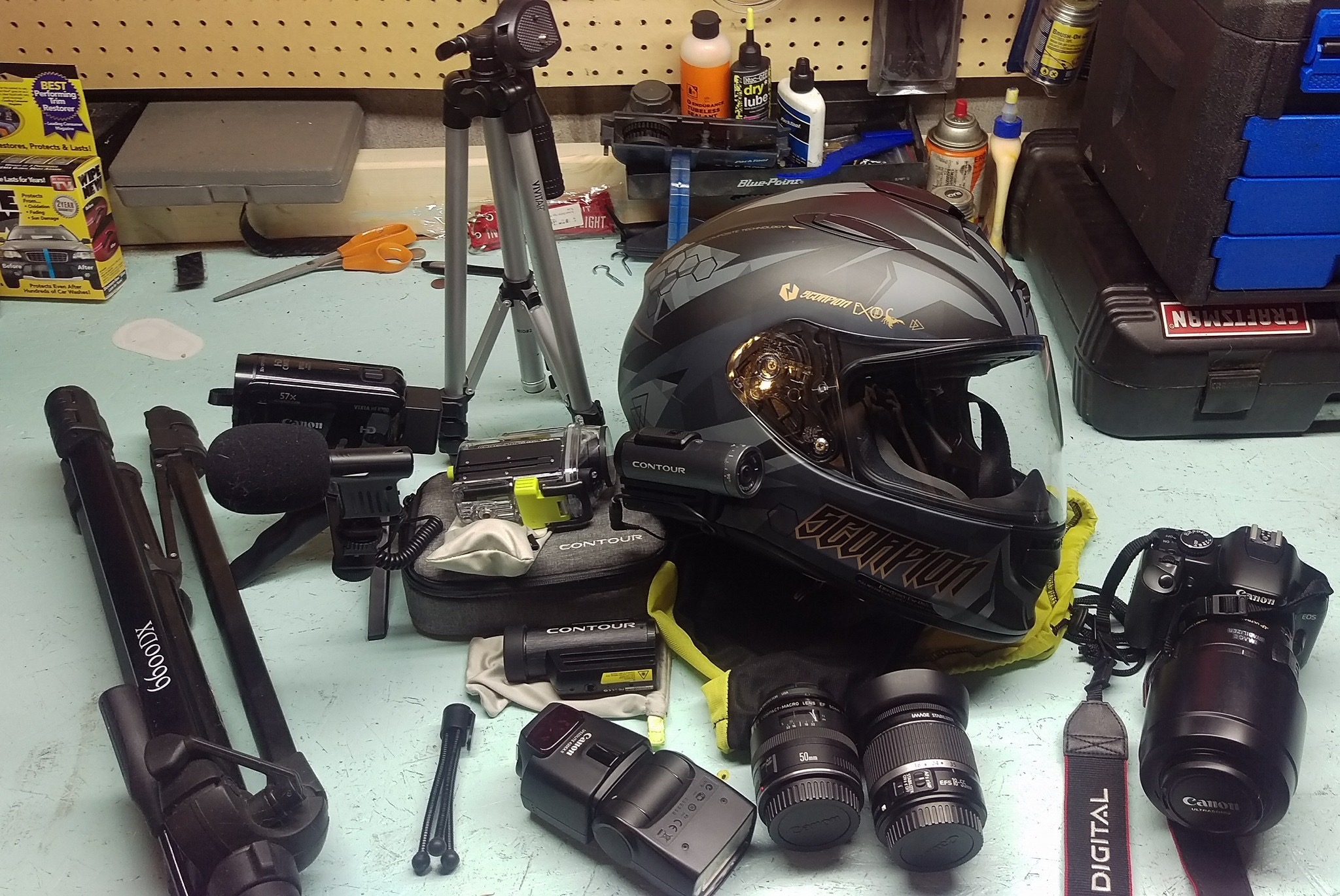 My current setup. I have my Contour+2 on my helmet with a Olympus ME15 mic. I usually have another camera with a mini tripod in my backpack or in the pass seat. I go on photoshoots I the area so I have a backpack for my Canon camera.