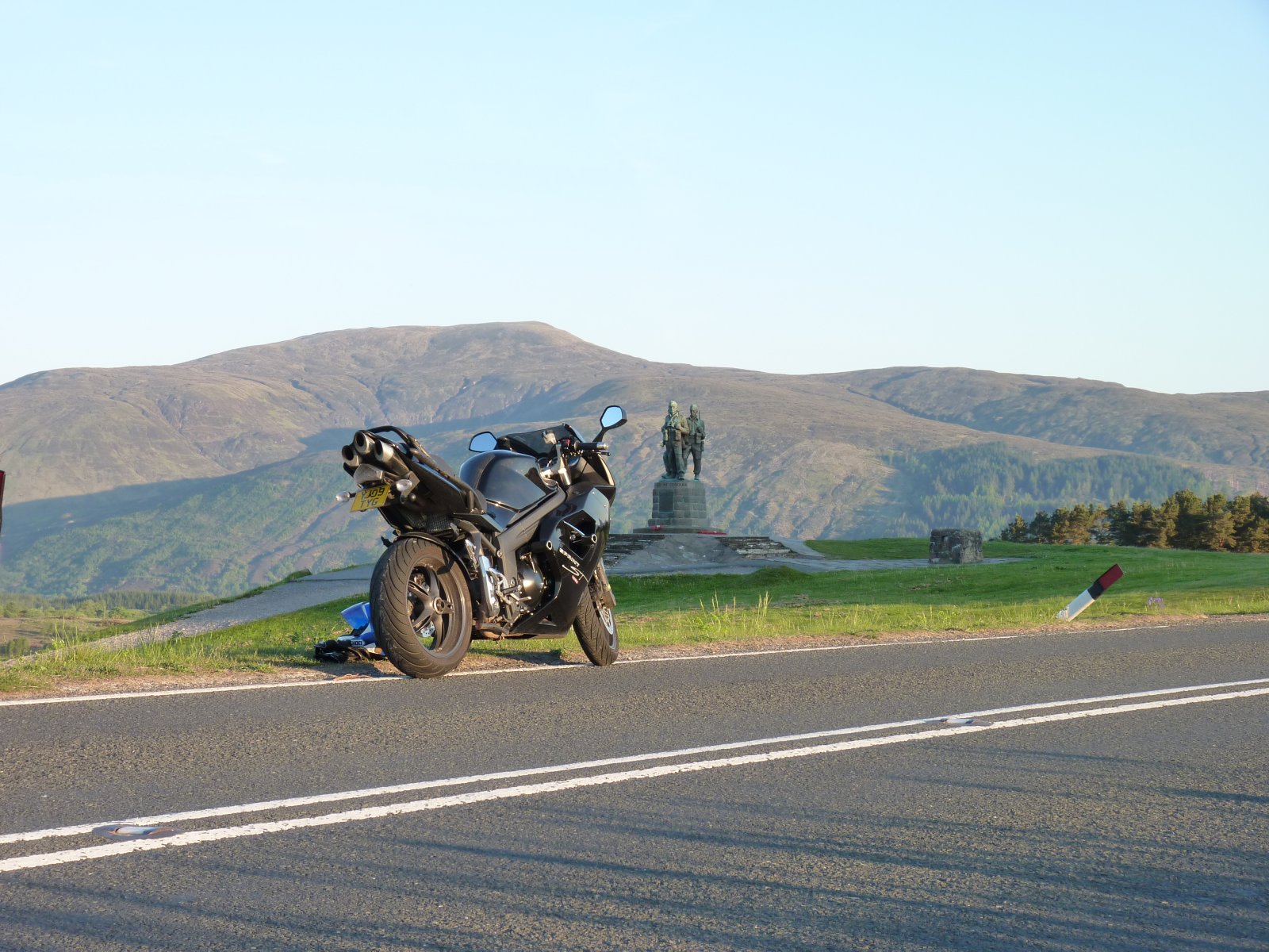 My profile pic has my bike showing on its kickstand side, which just seemed to naturally fit the standing position I wanted to take behind it. The bike goes low-to-high and I can rest my hands easily on the tank.