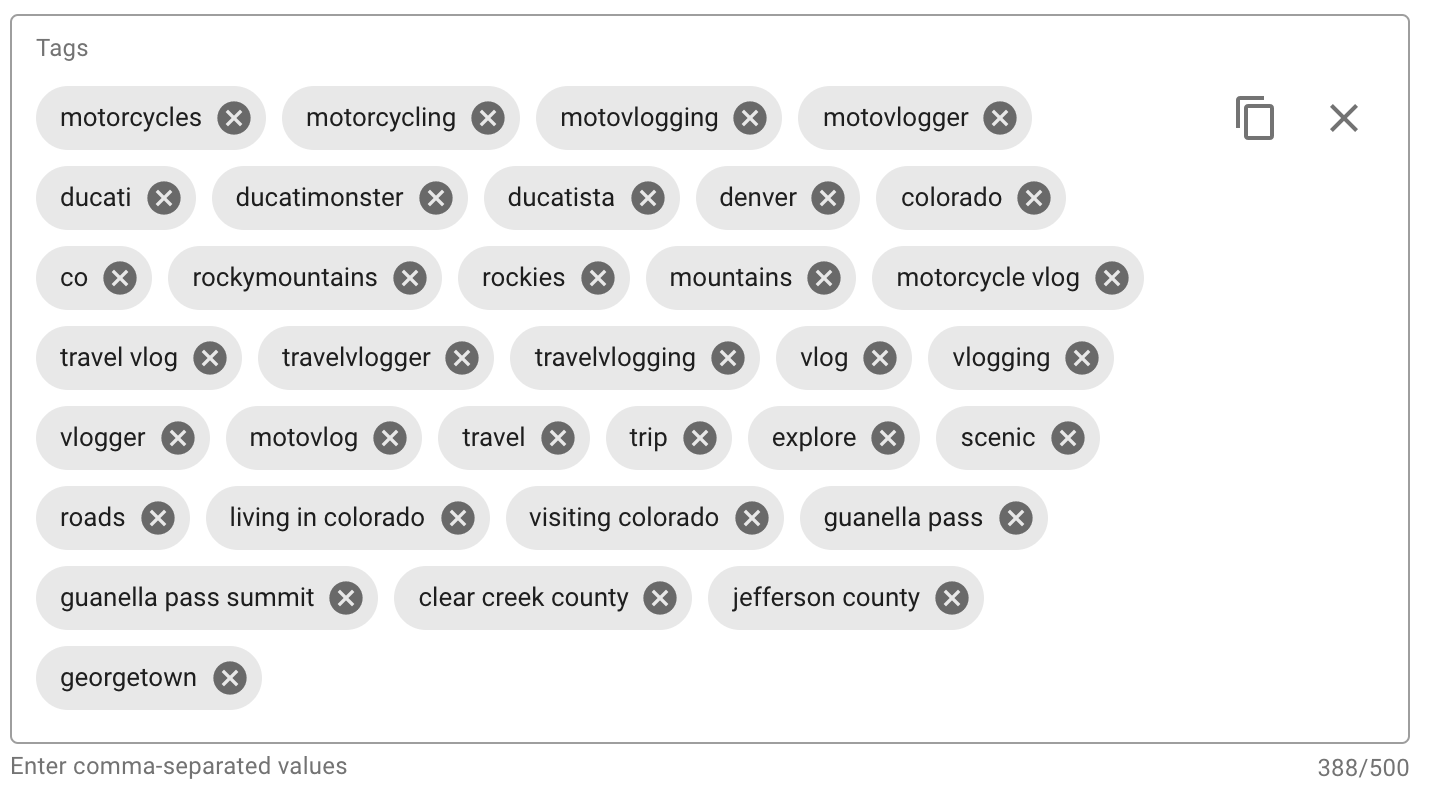 - 5-8 tags total (help YouTube figure out what your video is; say more with less)